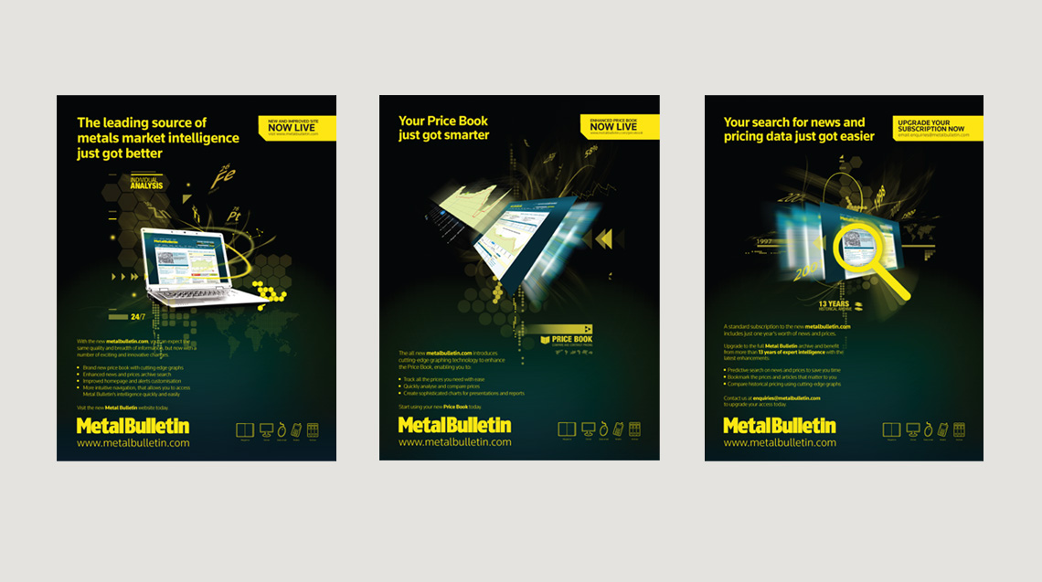 Metal Bulletin provides must-have timely information, including price indications, for the global non-ferrous metals and steel markets. We created a portfolio of compelling and creative adverts to promote the launch of their new website and services.