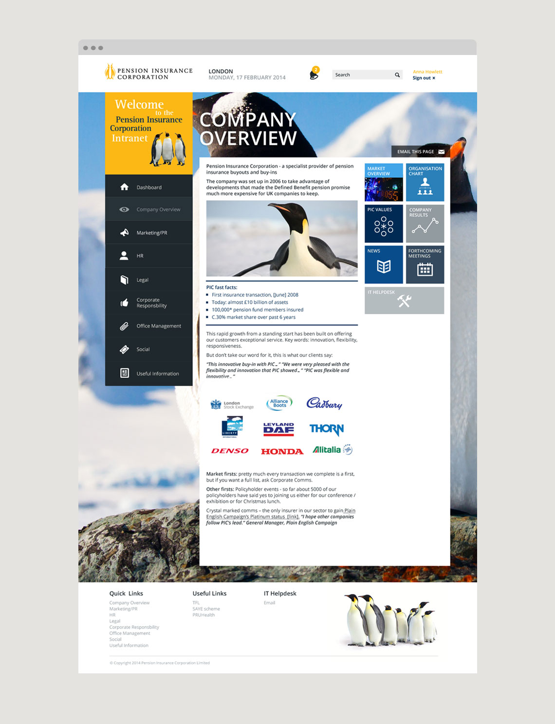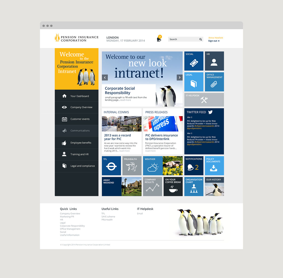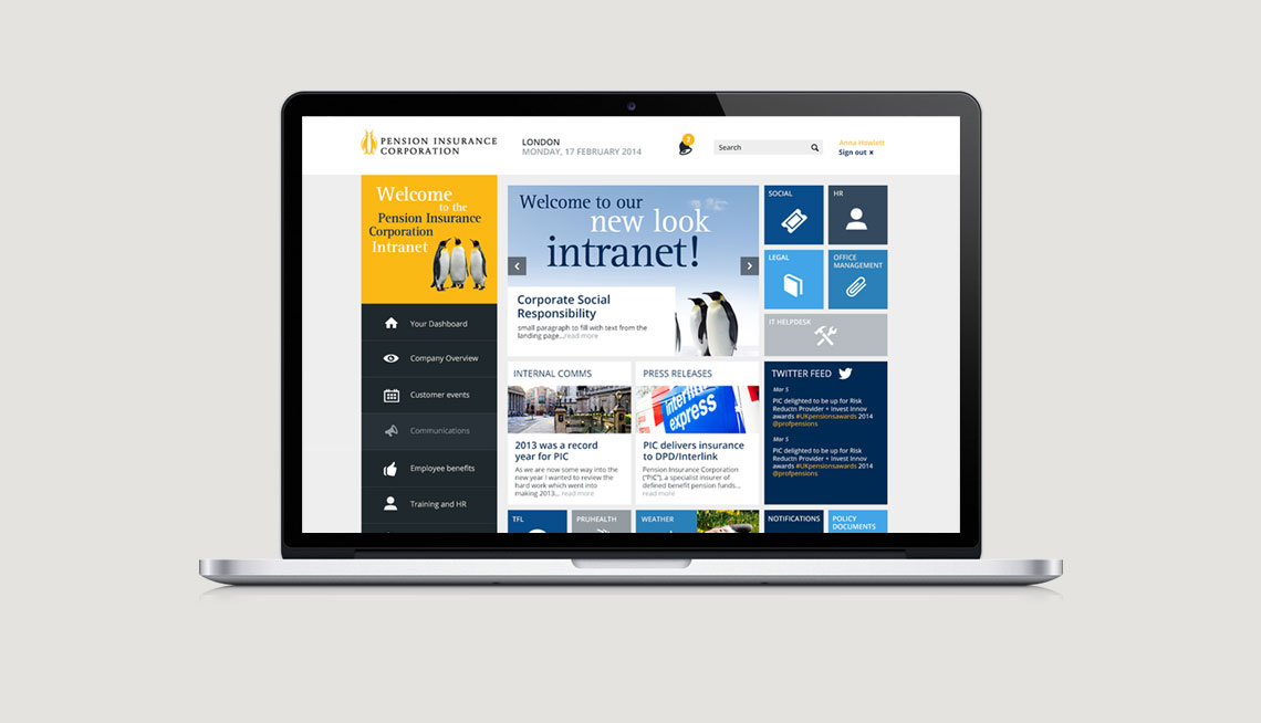 We were approached by Pensions Insurance Corporation (PIC) to design and build a new intranet facility for internal personnel. Due to rapid growth, the company needed a new single reference point that could provide staff members with important information. The intranet needed to be integrated with their own IT software Active Directory. As a security conscious company they needed to be able to take ownership of staff members personal details without relying on outsourcing.